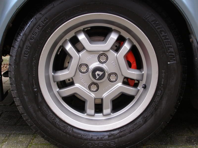Ook heb ik de remtangen rood geverfd, met zo'n speciaal verfsetje daarvoor. K*tklus! Het is moeilijk om de dingen eromheen af te plakken en je kunt het niet precies verven. Op afstand zie je dat natuurlijk niet, maar van dicht bij zie je wel wat gemors etc. Maarja, het staat wel stoer, racing red. De remtrommels zijn ook roestig, maar die worden zwart. Rood zou wat teveel van het goede zijn;)