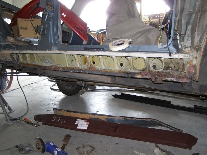 Op dit moment was hij bezig met de rechterdorpel. Ik heb via euro-autoparts.com nieuwe Klokkerholm dorpels besteld. De schadehersteller was hier heel tevreden over, zeer goede kwaliteit zei hij.
