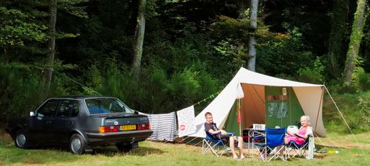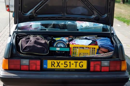 Tijdens de eerste stop ergens in Limburg. (koffer, hoedenplank en de linkerhelft van de achterbank lagen helemaal vol)