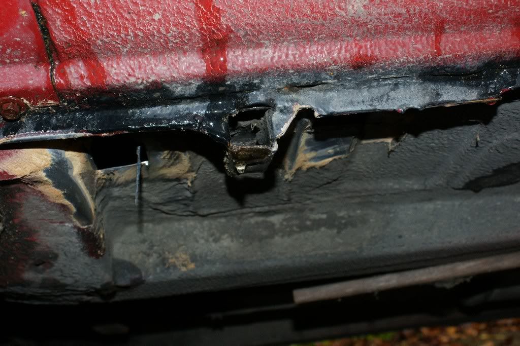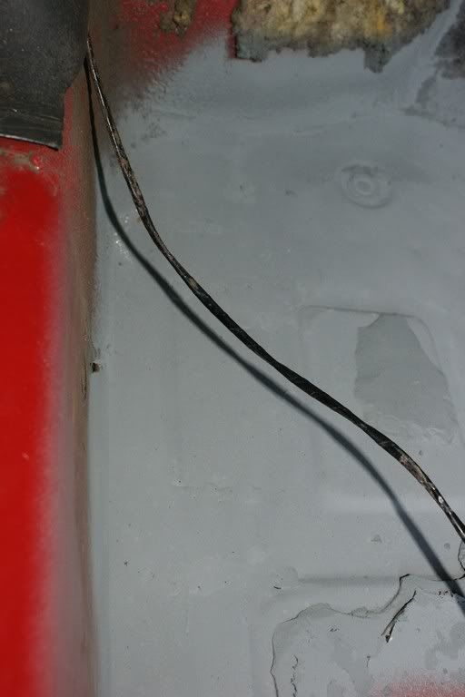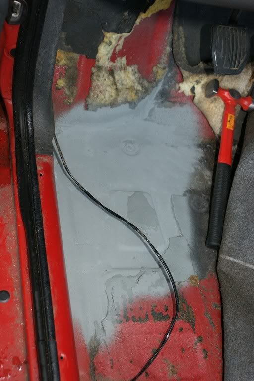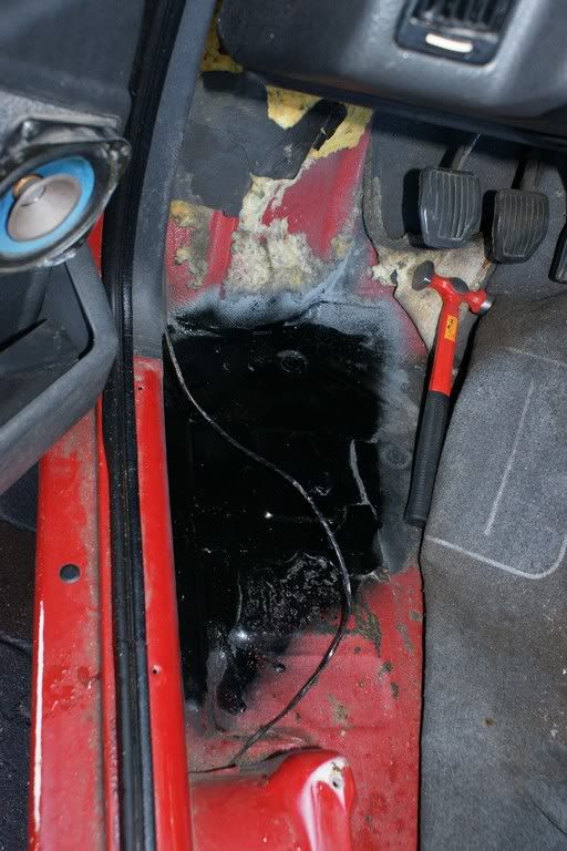 Vandaag het probleem grondig aangepakt, moest ook wel, want na mijn ritje stond mijn hele voetenruimte blank in het water! Dus bij thuiskomst, alles eruit gehaald an op het eerste zicht buiten veel water helemaal niet veel te zien, twee kleine plekjes... Slijpschijf erbij, staalborstel erop en ja hoor... 2 plekken met gaatjes!