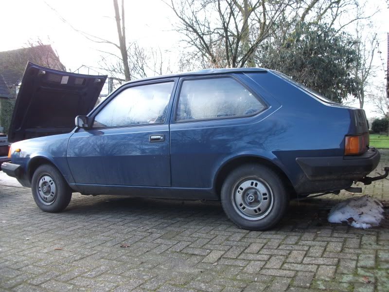 Als hij netjes was geweest zou ik hem zeker deze kleur houden... Maar de motorkap begint al aardig te roesten, en de deuk op het dak ook. Dus er moet zoiezo lak op/aan/tegen/overheen. Lapjeskat ziet er zoiezo niet uit...