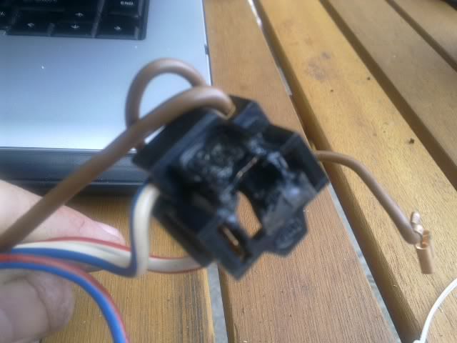 Dus lamp uit de connector gehaald.....hee die ziet er vreemd uit.En toen kwam ook de oorzaak aaan het licht.De dimlicht aansluiting op de lamp was los en heeft geprobeerd zichzelf weer vast te lassen.....