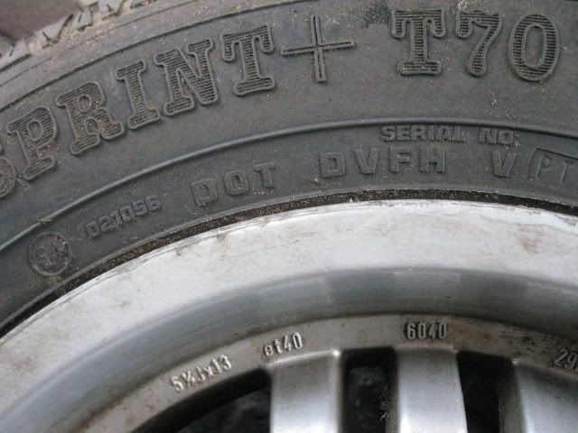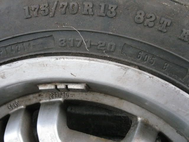 De banden eromheen echter... ik heb een fotootje gemaakt van de DOT-code, weet iemand voor welk jaar die code staat? Ik denk zelf ergens jaren '80 o.i.d.