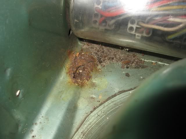 de plek bij de wielkast achter. Ik had verwacht een dichtgeplamuurd gat aan te treffen, maar dit viel reuze mee! Ook hier leek het erger dan het is. Roest weggeschuurd en fertan erop: