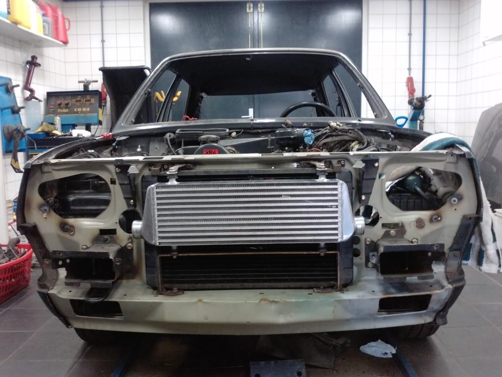 Ja, de hele frontbalk is losgeslepen. Ik had nog een donorauto die ooit schade voor heeft gehad. Daar hadden ze een nieuw front er los voor gezet , maar die auto is nooit meer de straat op gegaan. Dat nieuwe front kon ik dus perfect gebruiken voor mijn project gebruiken. Steeds als ik tijd heb zal ik stukje bij beetje met foto's laten zien hoe de auto is geworden. Ik gebruik de auto nu dagelijks. Hier kun je zien dat ik het front demontabel heb gemaakt zodat het er voor weg te halen is. Ook bepaal ik hier de plaats voor de inrercooler met slangen.