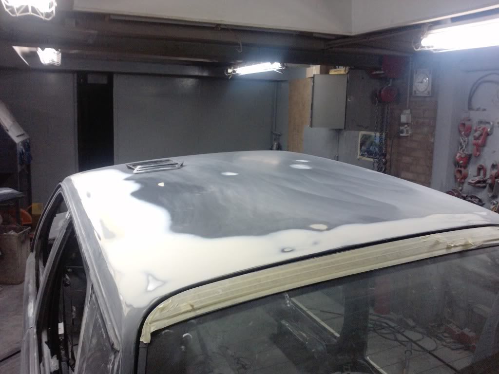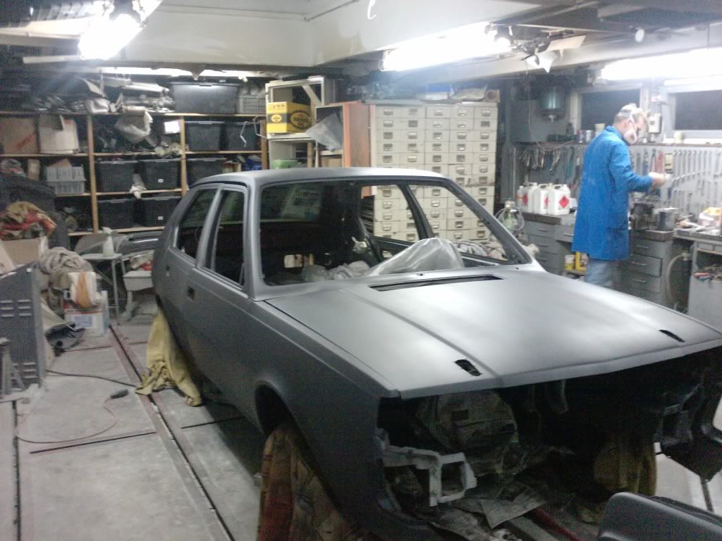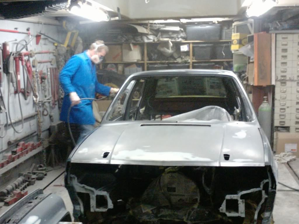 Na al het strak maak werk is de auto in de spuitplamuur gezet. Ik heb gekozen voor zwarte spuitplamuur omdat de auto ook zwart werd. Dit is een voordeel als je ooit (hopelijk nooit) ergens een putje krijgt door b.v. steenslag. Je kijkt er dan niet gelijk zo wit op. Spuiten in de spuitplamuur gewoon in de schuur, de auto moet toch helemaal na geschuurd worden. Het echte spuitwerk natuurlijk in een stofvrije kabine.