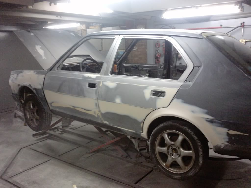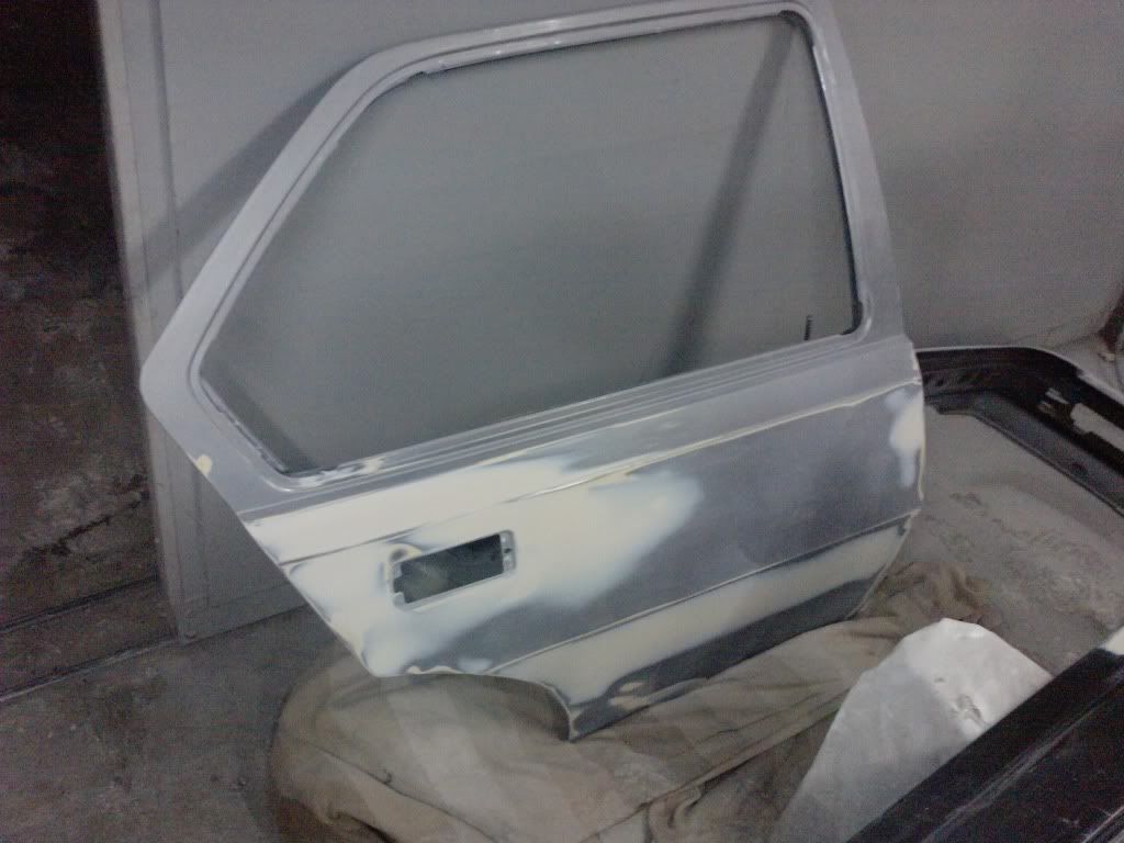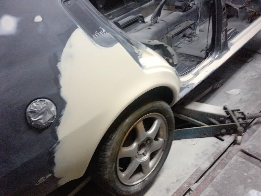 Zo netjes in de spuitplamuur. Nu even laten drogen en dan weer schuren, schuren e nschuren. Zoals bij zoveel dingen is de voorbereiding voor het spuitwerk zeer belangrijk. Je kunt de auto zo mooi laten spuiten als je wilt, als er allemaal schuurkrassen of later van die eilanden ( na zakken ) in komen is al je werk voor niks geweest. Dit is dus een zeer belangrijke fase. Laat de aut oeen tijdje staan en bekijk haar goed. Nu kun je nog veranderingen aanbrengen. Dit was mijn laatste stadium voor het spuiten.