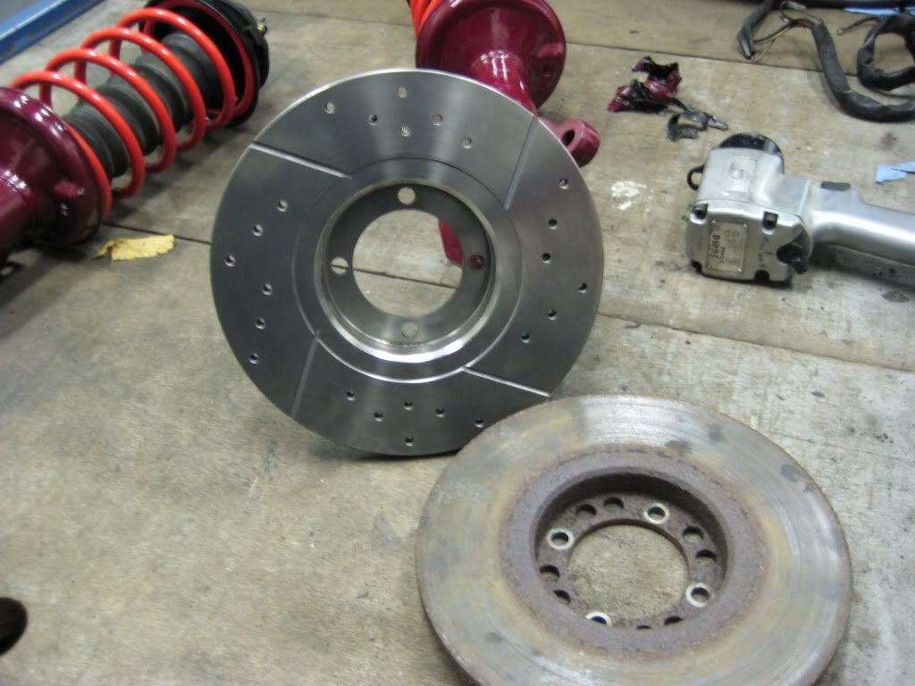 Klaar, direct maar even de schijven monteren. Schijven zijn gegroefd/geboord, deze samen met ferodo remblokken gemonteerd. Ook de remslangen voor gevlochten remslangen verruild.