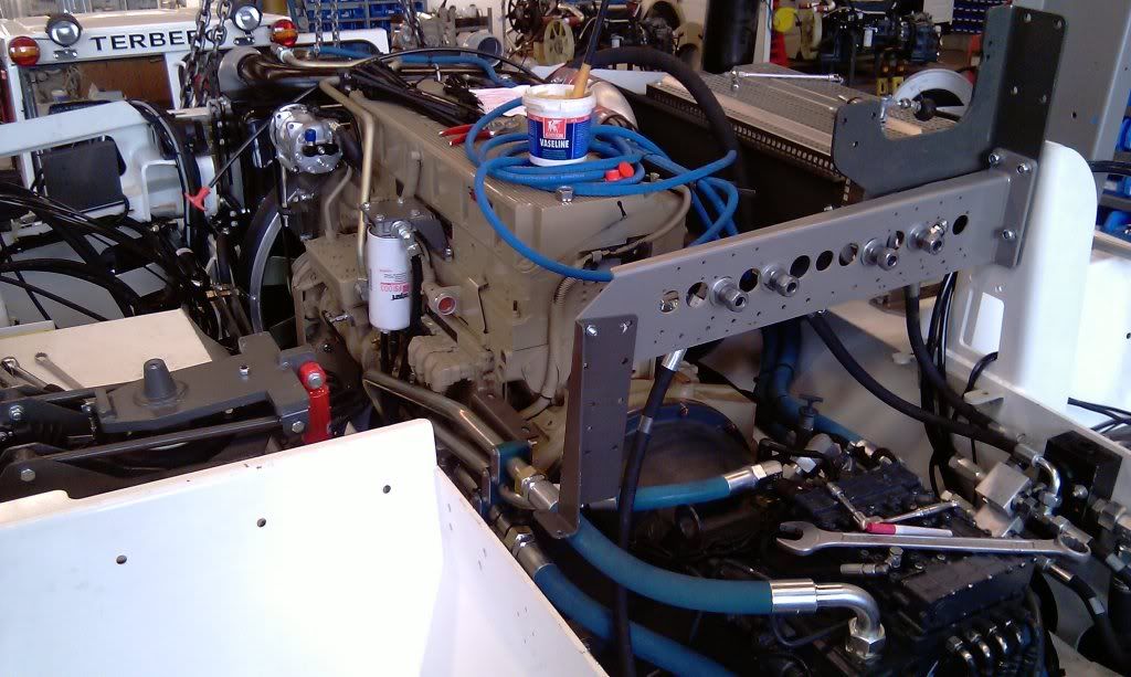 achter op het chassis een 40mm persleiding en een 100mm retour, achter de cabine 4x 18mm leiding waarvan 2 drukgereduceerd.