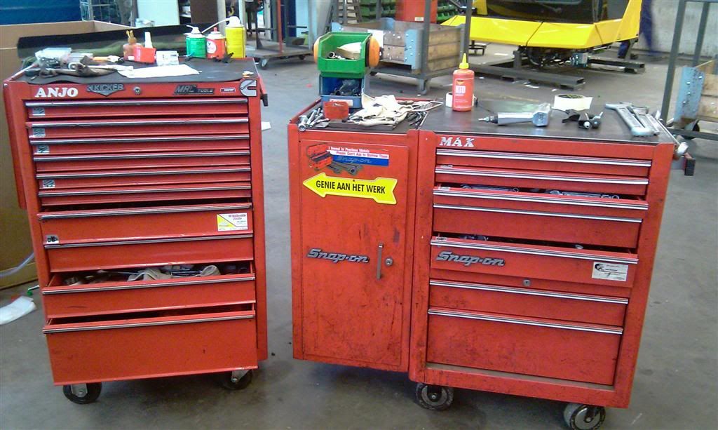 spuitbussen/sprays heb ik een bakje voor achterop m'n kar, documentatie ligt op de werkplek in een bureaulade en voor overalls en aanverwanten heb ik gewoone een kluisje, geen zin om al die troep continue mee te slepen:+
