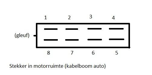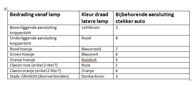 Uitleg tabel: linker kolom = draden vanaf de vroege koplamp, middelste kolom = kleur die dezelfde draad heeft bij een latere lamp, rechter kolom = op welke aansluiting hij hoort op de stekker in de motorruimte. Die getallen slaan op de volgende tekening: