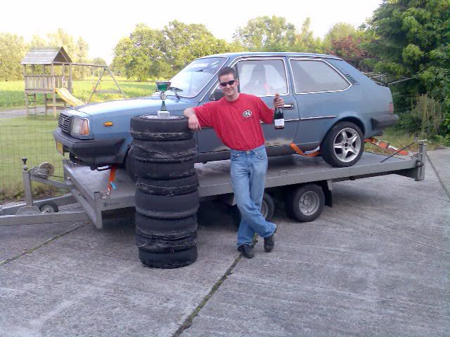 De Volvo 244 stond al klaar met de 343T op de trailer. Extra cardanassen mee, gereedschap, extra bedrading, 2 kisten gereedschap, aandrijfassen, 2 jerrycans benzine en belangrijk: 8 extra velgen.