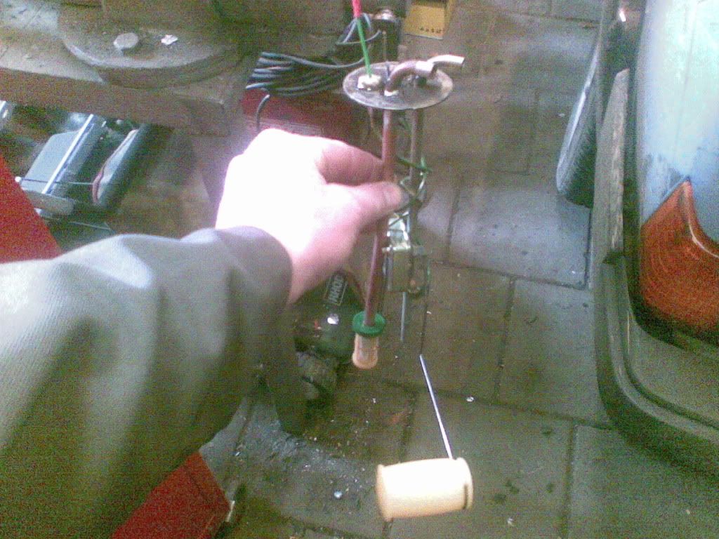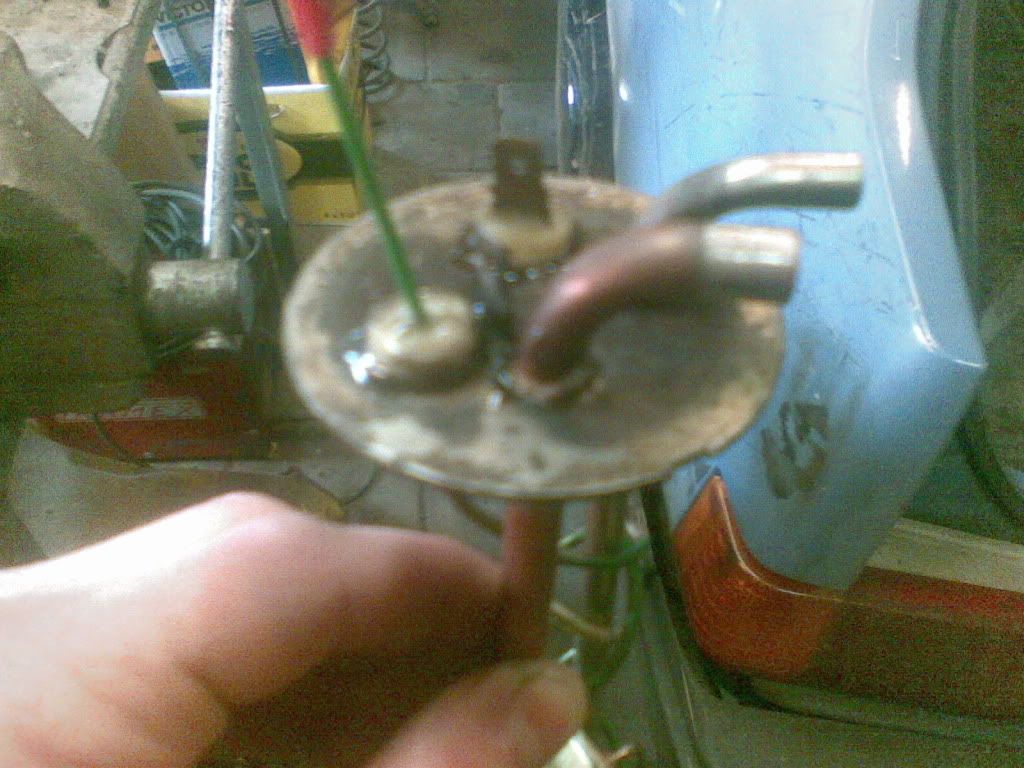Eerst de originele retour uitgeboord. Daarna een nieuw buisje in gesoldeerd. Om er zeker van te zijn de doorvoeren van de draden rondom afgekit met 2-componenten expoxyhars (bestand tegen benzine).