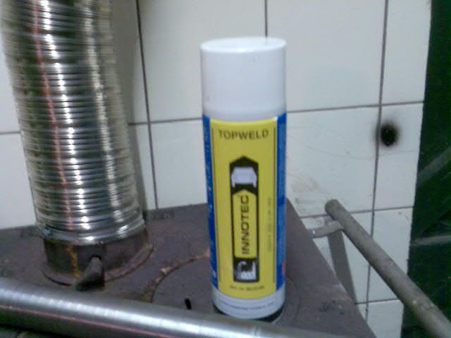 Anti-spatspray. Ideaal spul. Hiermee spuit ik de binnenkant van de lasbochtjes en buis in zodat de lasspetters geen houvast hebben. Wanneer deze namelijk achterblijven in het spruitstuk en je gaat rijden en ze komen los.............die wil je niet in je turbo hebben :nono:.