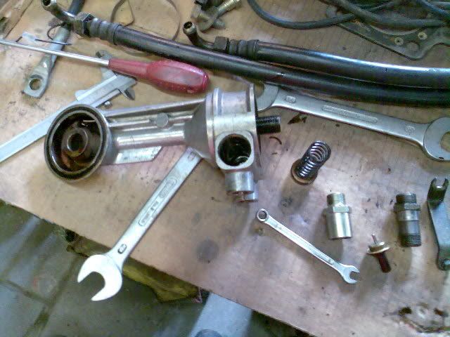 Vandaag effe de boel een beetje schoongemaakt. Kunnen we meteen de thermostaat even testen. Als ik me niet vergis kan het gedeelte, waar het oliefilter op gaat (rechter gedeelte), eraf. Dat wordt hij al een stuk compacter. Dan nog effe kijken of ik de goede verloopbus kan vinden en dat kan hij gemonteerd worden.
