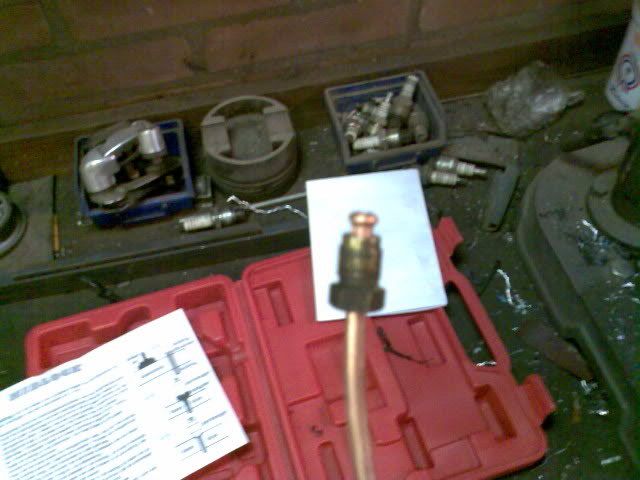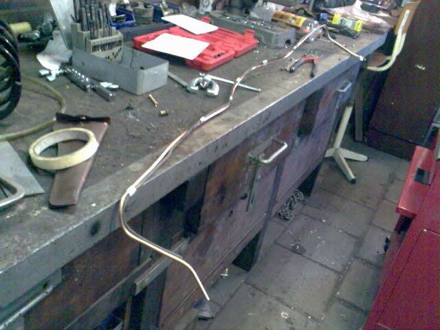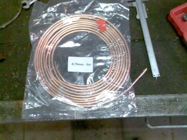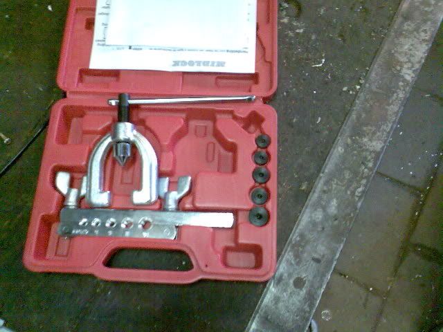 Terwijl ik de vorige keer bezig was met de stabilisatorstang achter heb ik per ongeluk de remleiding aangetikt met de slijptol :f. Die was dus aan vervanging toe. Schijnbaar was het best simpel zelf te doen. Ik kon kiezen om een bestaande leiding van een reserve aandrijfas te snukke. Maarja, da's eigenlijk prullen dus heb ik maar een nieuwe gemaakt: