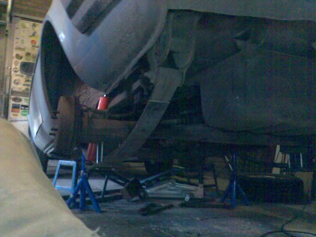 Auto netjes omhooggezet op assteunen. Ook de wielen erafgehaald voor het gemak.