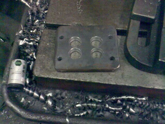 Effe een stukkie strip afgeknipt en de gaten geboord voor de draadeinden. Daarna de gaten geboord om mooie ronde hoeken te krijgen in het doorlaatgat. Vervolgens het middelste gedeelte doorgeslepen en bijgewerkt met een freestol.