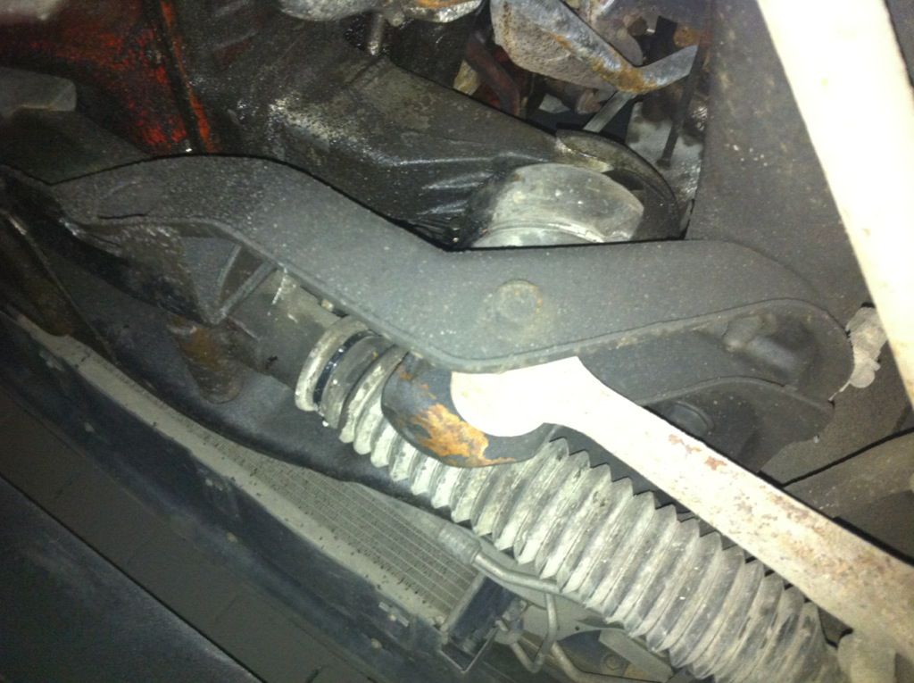 Tussen de draag arm en de stuurhoes? zit een stukje ijzer omgebogen met een oog er in.