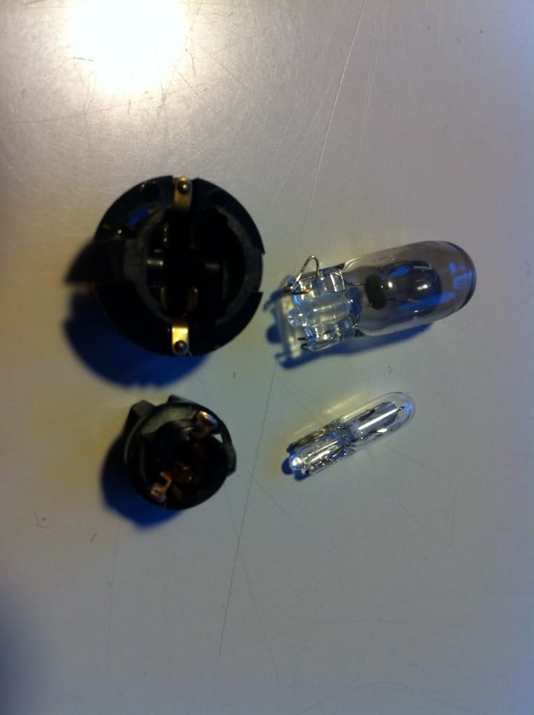 Die uit de tellerbak heb ik al vervangen (door gewone gloeilampjes van meneer Frits). Op de sleuteldag zag ik dat in de bestuurdersdeur het gloeidraadje nog maar heel zielig gloeit, die wil ik dus gaan vervangen. Maar er moet wel wit licht uitkomen en niet dat wit, dat ze wit noemen, maar in de praktijk blauw is. En aangezien ik binnenkort toch nog wat op moet gaan halen bij de AMH...