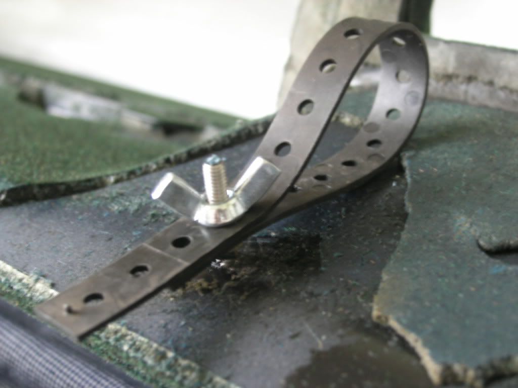 Om de kabels allemaal weg te kunnen werken heb ik het bestaande systeem (van die flut klemringetjes) aangepast. Ik heb M4 draad op de pennen getapt en vervolgens vleugelmoeren gebruikt om de rubberen bandjes vast te maken. Ook handig, je kunt ze namelijk los halen onder het dashboard en er een kabel bij leggen.