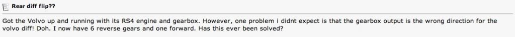 De bak was stuk, dus op de sloop een identieke andere gehaald en toen we hem na twee dagen van de brug van de bevriende garageman wilden afrijden bleek dat Renault twee types maakte van dezelfde bak: een rechtsdraaiende en een linksdraaiende. Je zag het alleen aan een "D" (droit) en "G" (gauche). Juist, 4 versnellingen achteruit dus.....
